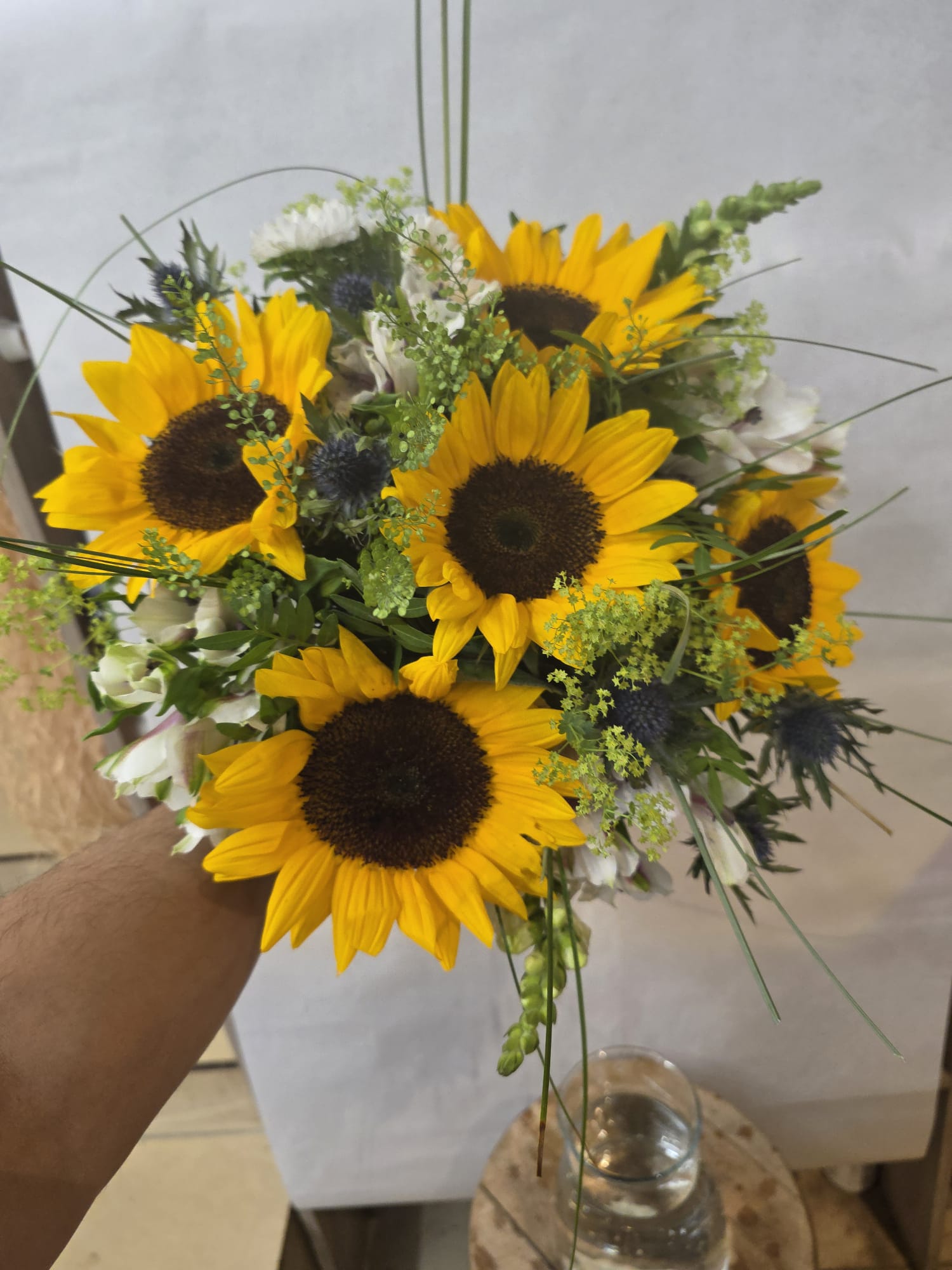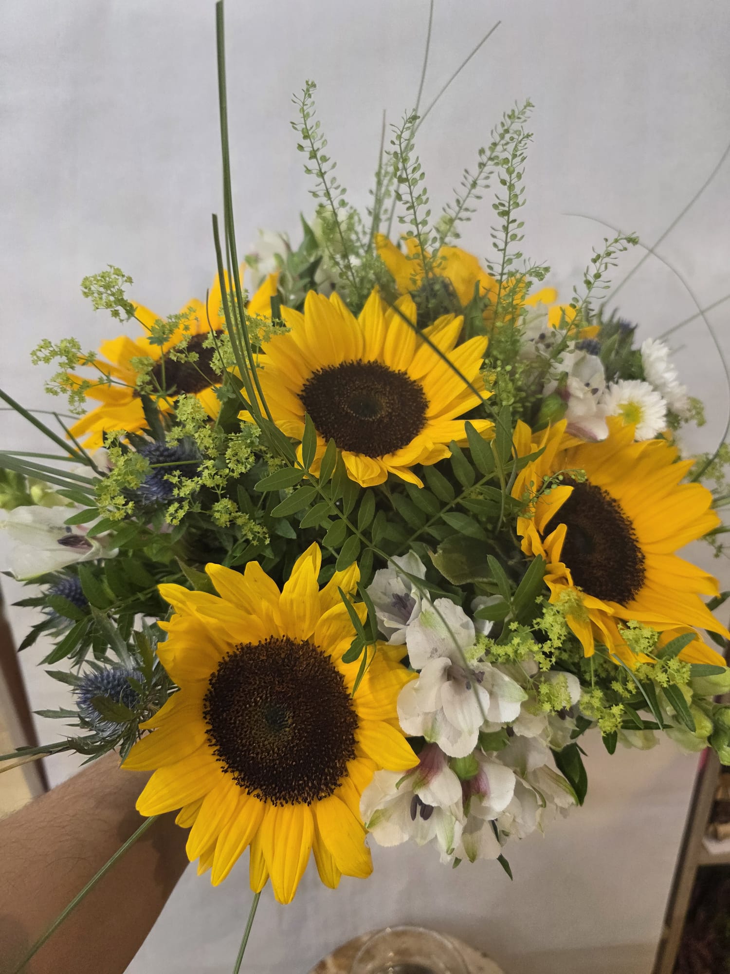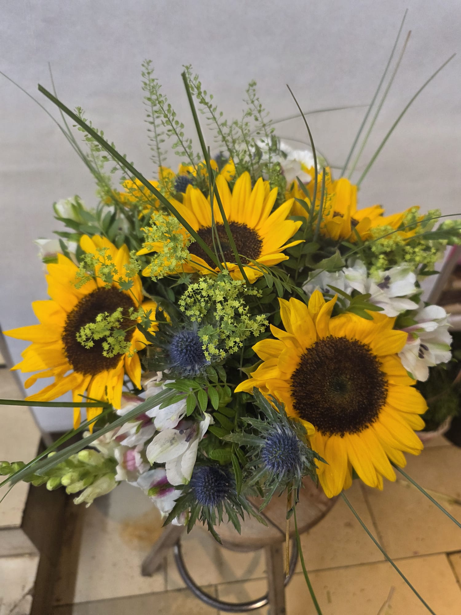 Ein harmonischer Strauß aus leuchtenden Sonnenblumen, eleganten Alstroemerien und verspielten Löwenmäulchen, kombiniert mit der besonderen Note der violetten Edeldistel, ergänzt durch Ziergrün und feine Gräser.